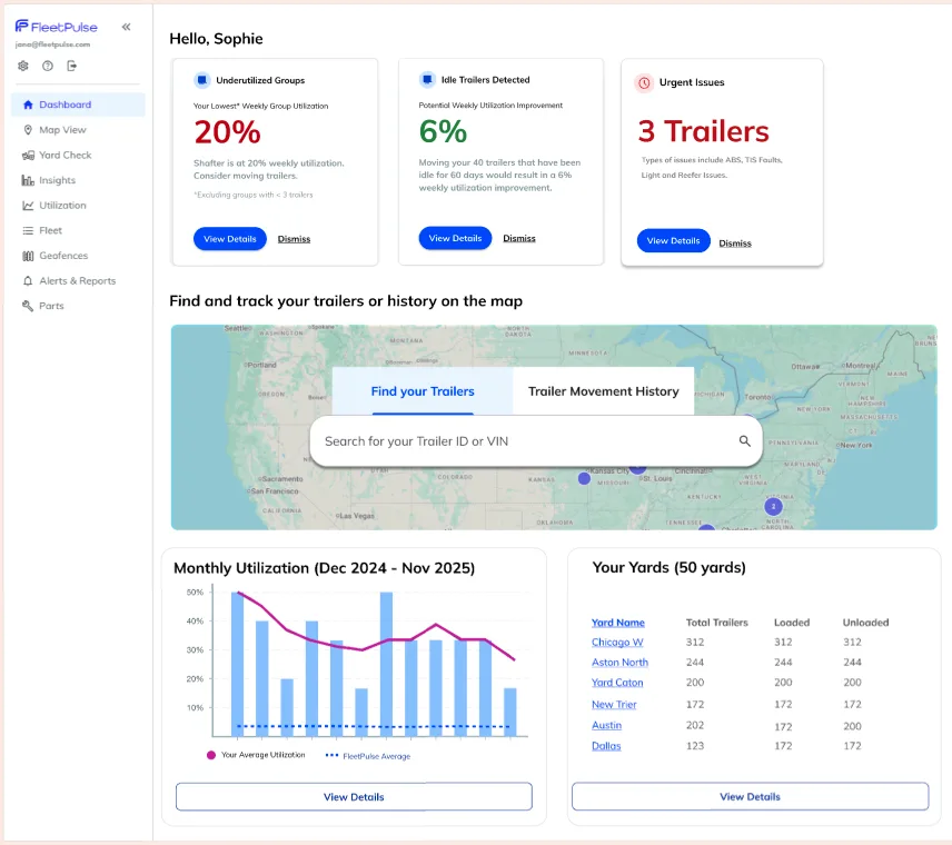 At FleetPulse, we build what our customers need. This month’s updates address three of the most common requests we’ve heard: a dashboard that puts your priorities first, email reports that are actionable, and visibility tools for companies that lease trailers to others.