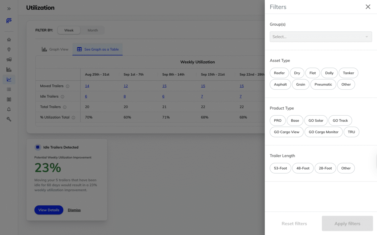 Flexible Filtering & Segmentation: Analyze utilization by groups, asset types, trailer length, or product type. Need to understand how one group is performing? Filter to see just those assets. Want to compare performance across divisions? Easy.
