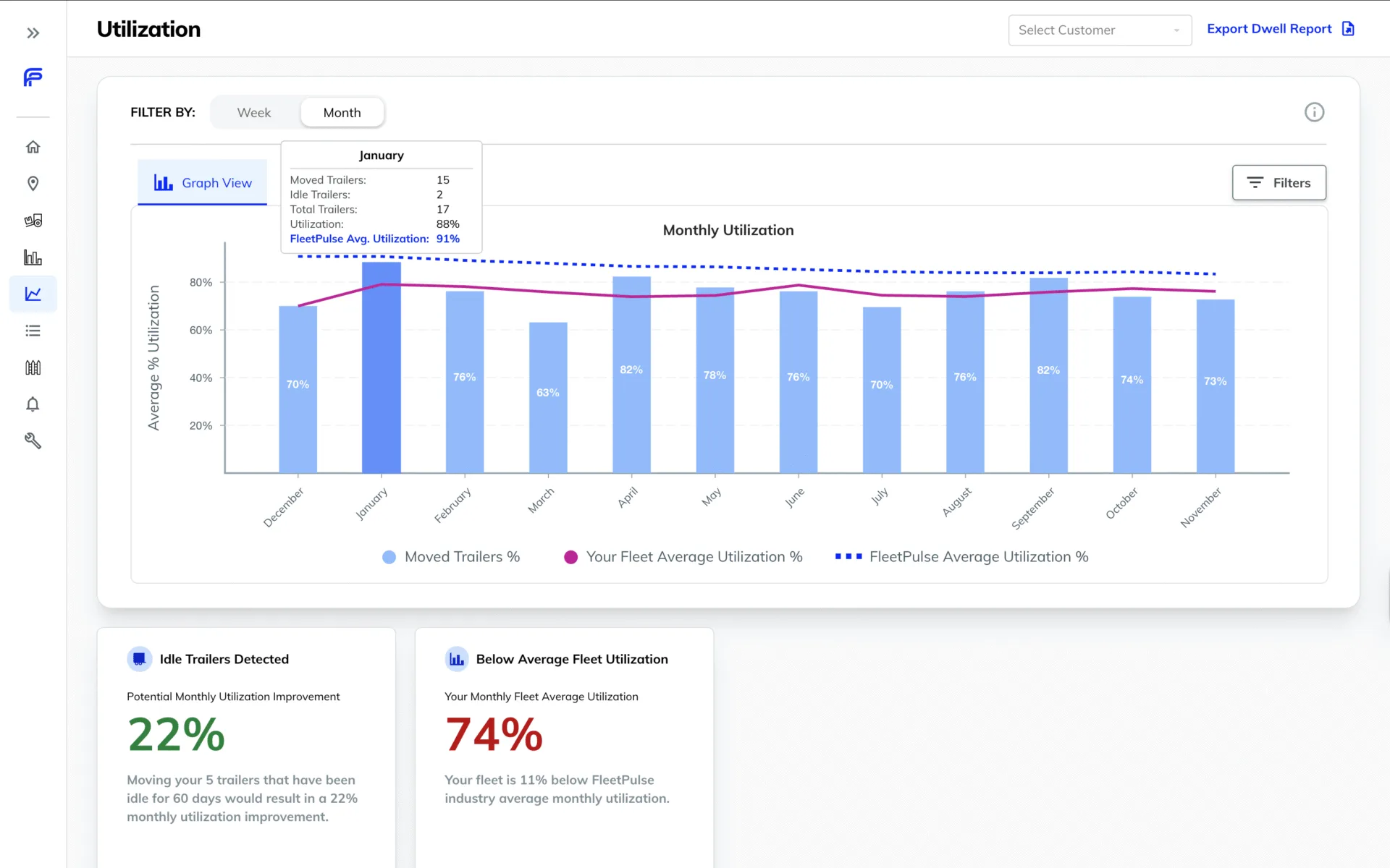 Real-Time Utilization Tracking: See exactly how many trailers moved each week or month with intuitive visualizations. Compare your performance against the FleetPulse average to benchmark how you’re doing relative to industry standards.